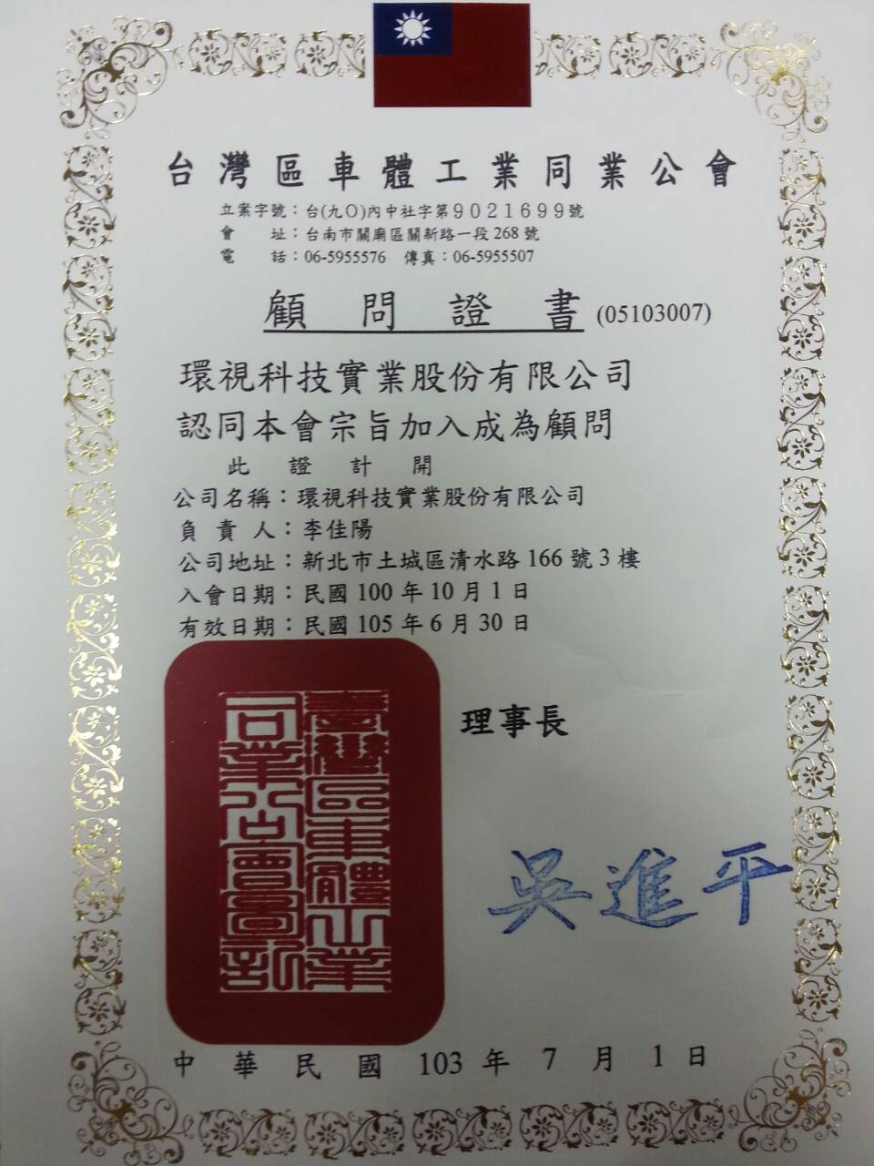 環視科技榮任台灣區車體工業同業公會顧問